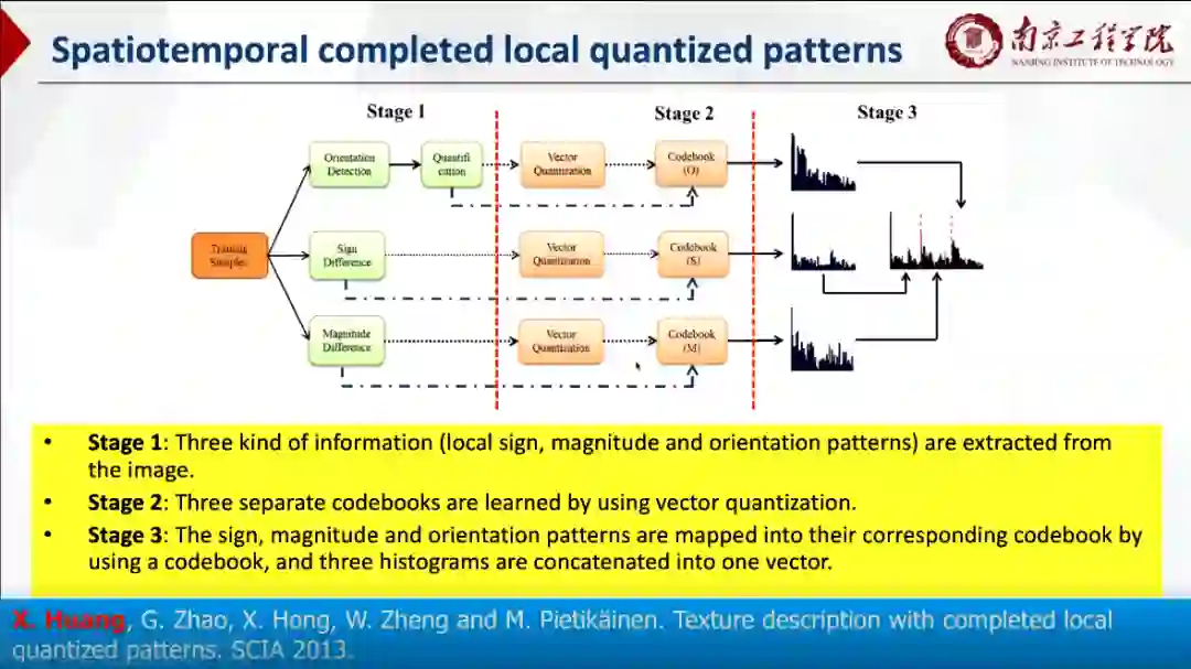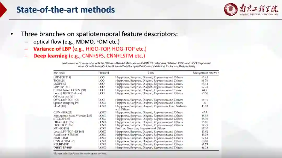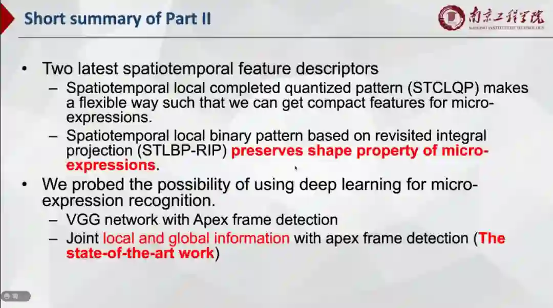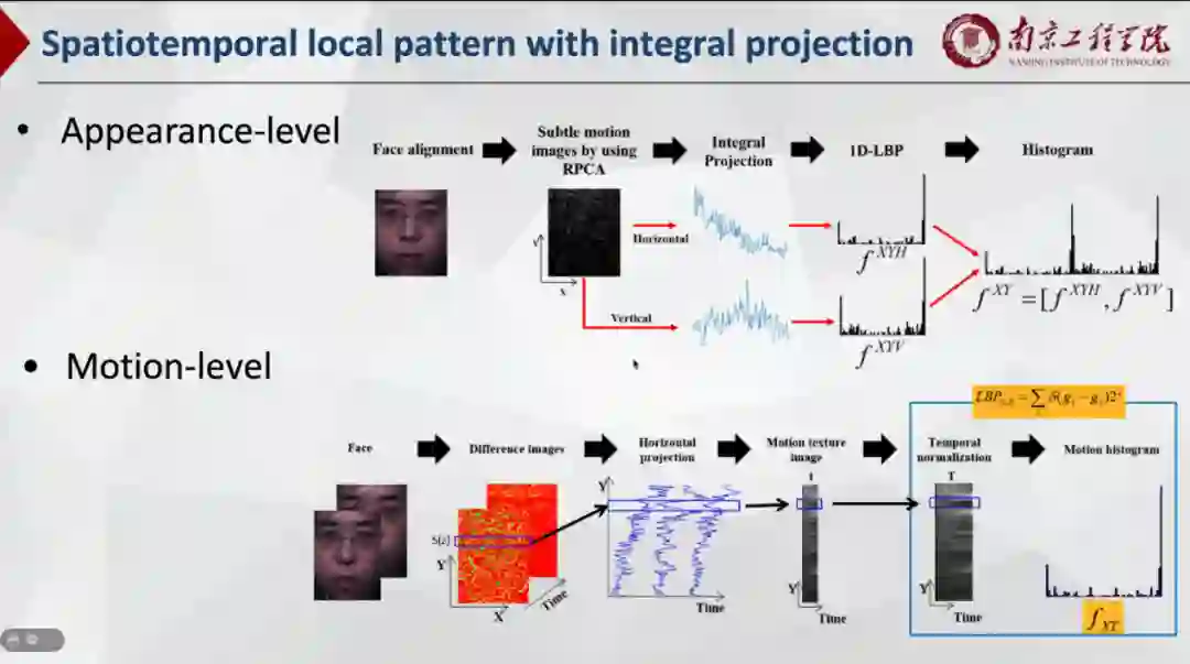 在传统方法的部分,黄教授首先介绍了在人脸和表情识别领域常见的特征Local Binary Pattern (LBP)、以及微表情研究中常见的时空特征提取方法。