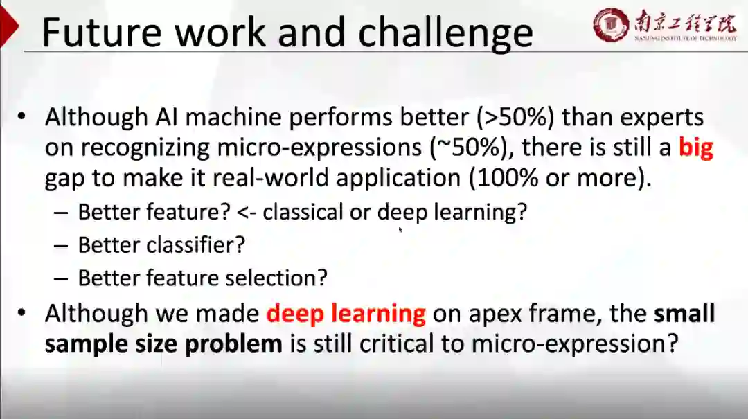 在讲座的最后,黄晓华教授展望了结合人工智能的微表情识别方法在未来的发展,从特征提取、分类器、以及微表情小样本问题等方面进行了分析。