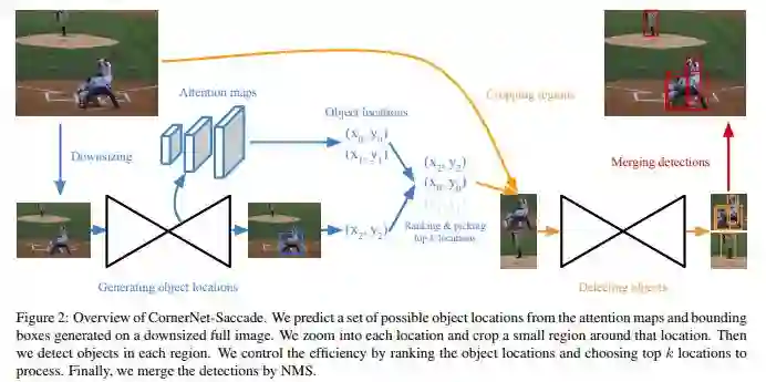 CornerNet-Saccade中的 saccades 是 single type and multi-object。CornerNet-Saccade 检测图像中可能的目标位置周围的小区域内的目标。它使用缩小后的完整图像来预测注意力图和粗边界框;两者都提出可能的对象位置,然后,CornerNet-Saccade通过检查以高分辨率为中心的区域来检测目标。它还可以通过控制每个图像处理的最大目标位置数来提高效率。具体流程如下图所示。