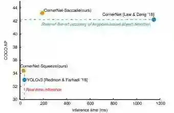 CornerNet-Saccade 是追求高准确率(mAP)的同时,尽可能提高速度(FPS),即准确率优先,其对标于CornerNet等算法。创新点:引入Saccade思想