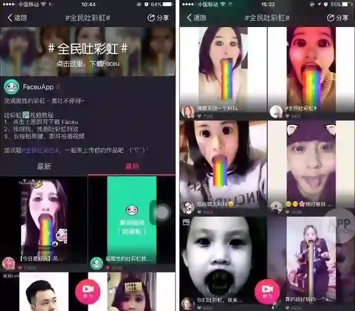 2016年1月,这款主打动态贴纸的美颜类相机发布了#全民吐彩虹#话题,并邀请《太子妃升职记》里的九王于朦胧助力,一举登顶应用榜,并在接下来的三周时间里持续霸榜。
