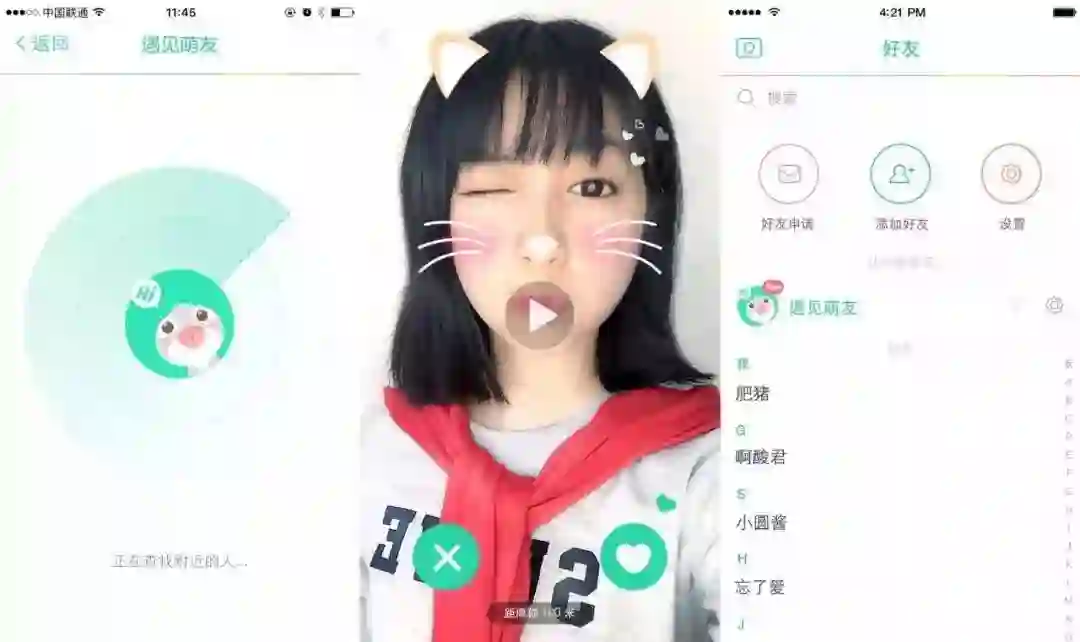 果然,FaceU趁热打铁上线了它的社交功能:遇见萌友,一个类似Tinder的交友功能;另外,FaceU还有通讯录和阅后即焚功能。