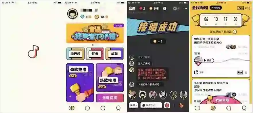 音遇是一款K歌接龙的语音社交软件,一共有“歌曲跟唱”、“歌曲抢唱”、“全民领唱”三种模式,基本形式就是给出歌曲的上半段、由用户接下半段,用户之间PK谁会的多、唱得好——当然,也会有逗逼属性点满的网友,上麦之后不唱歌只耍宝。