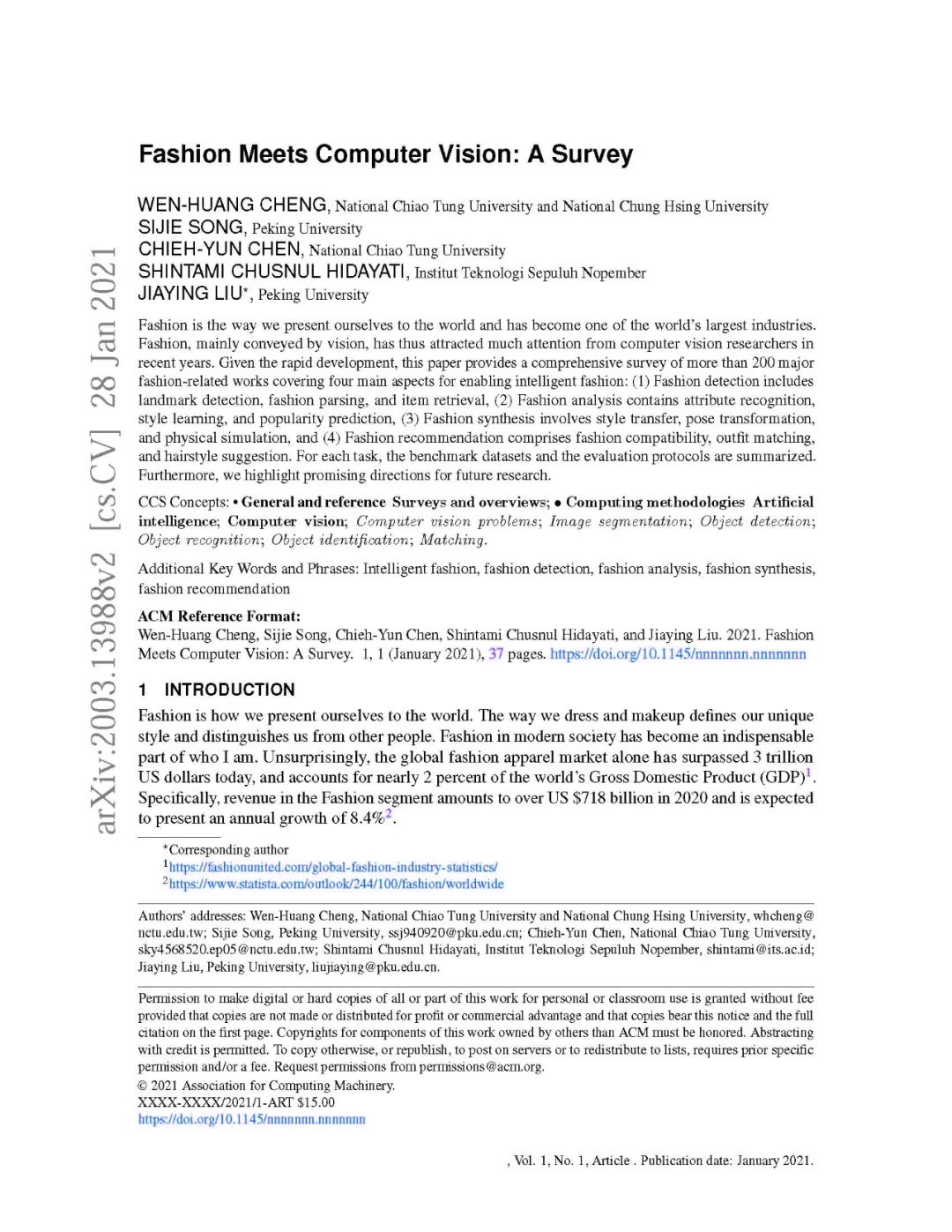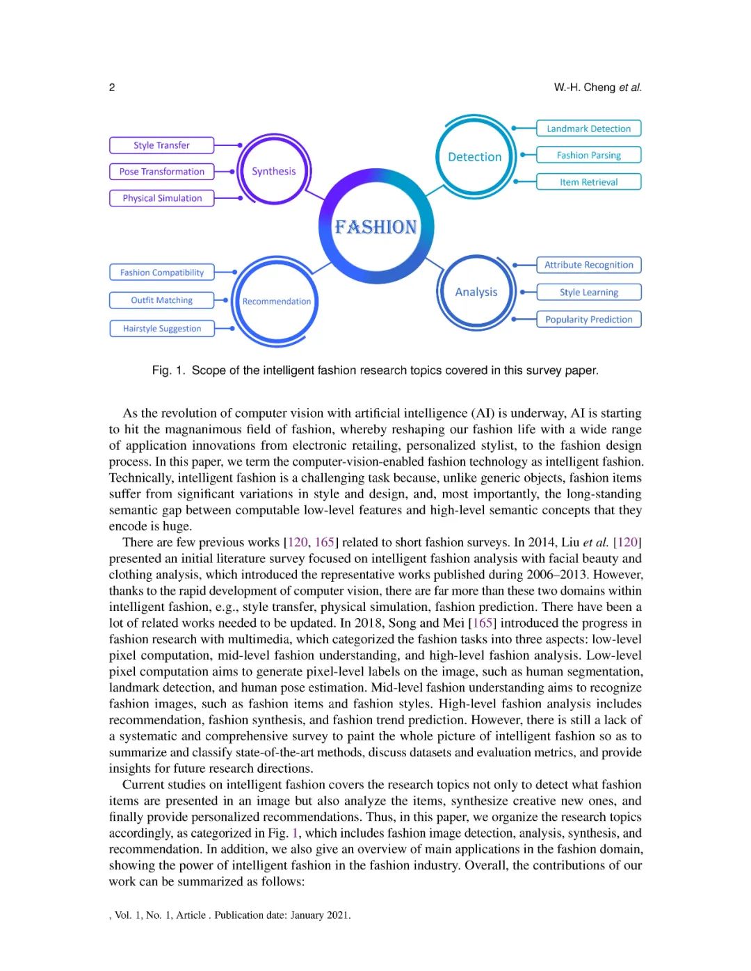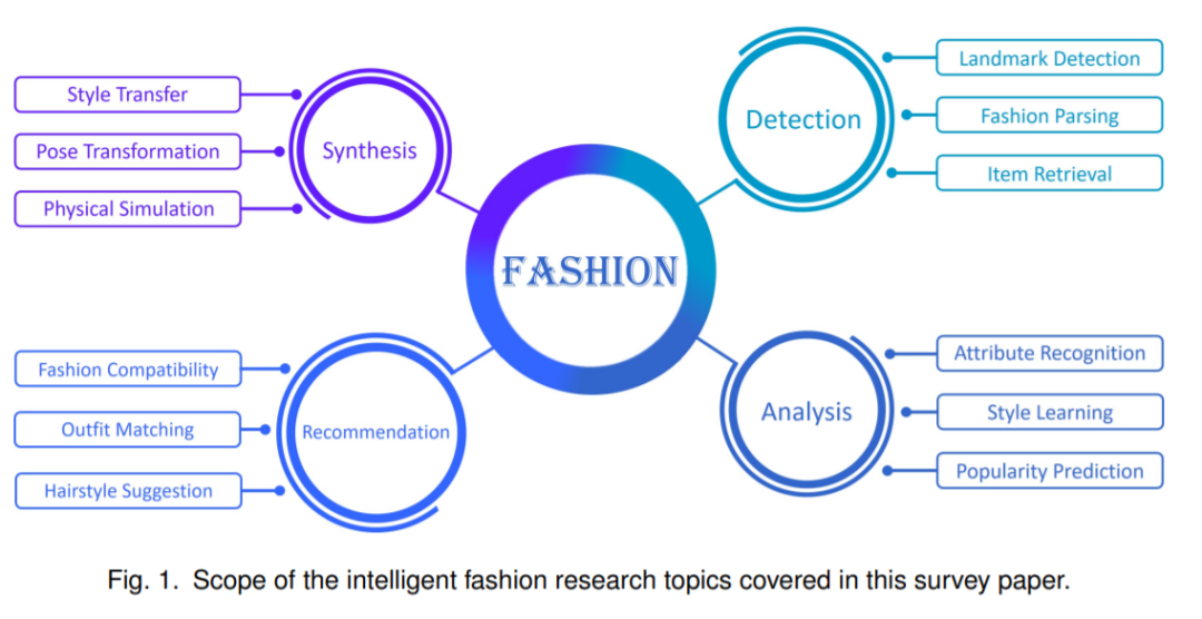 我们提供时尚领域的最新研究进展的全面综述,并将时尚研究主题分为四个主要类别:检测、分析、合成和推荐。