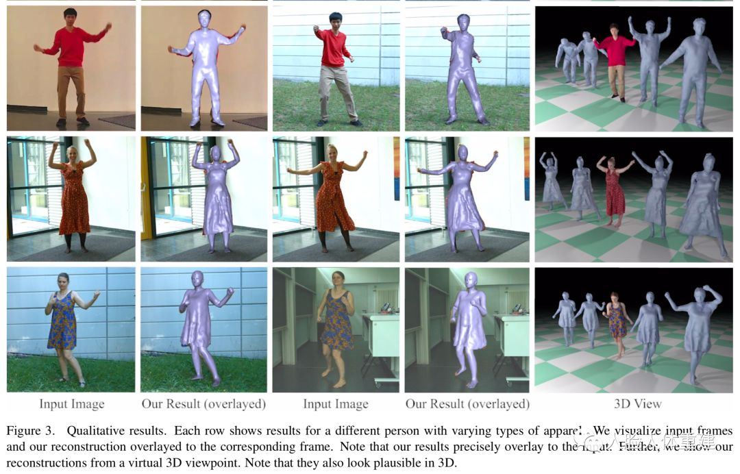 作者还将文章方法与之前方法包括 HMR [CVPR 2018]、LiveCap [SIGGRAPH 2019]、PIFu [ICCV 2019] 和 DeepHuman [ICCV 2019] 进行了定性和定量的比较,下面展示了定性比较的结果,本文的结果更加准确,在追踪阶段更加稳定鲁棒。