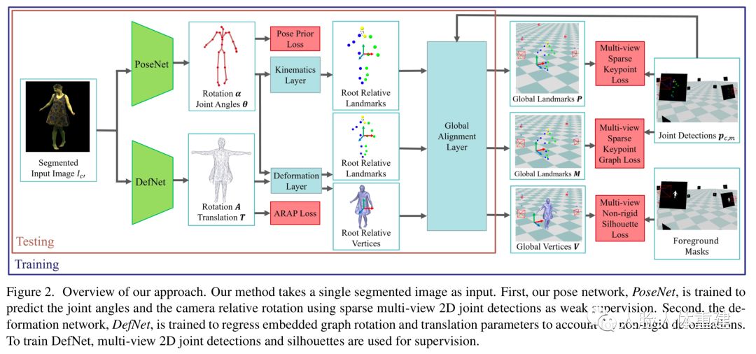 为了避免3D标注数据的使用,整个网络以弱监督的方向训练,为此作者提出了一个可微 (differentiable) 的人体变形和渲染模型,使得可以渲染人体模型并将其与2D图像进行比较,以此来反向传播损失。作者在经过校准的带有绿幕的多相机工作室中捕捉视频序列作为训练数据,但在测试阶段,只需要单目RGB视频便可以进行人体动作捕捉。整个方法流程如下图所示: