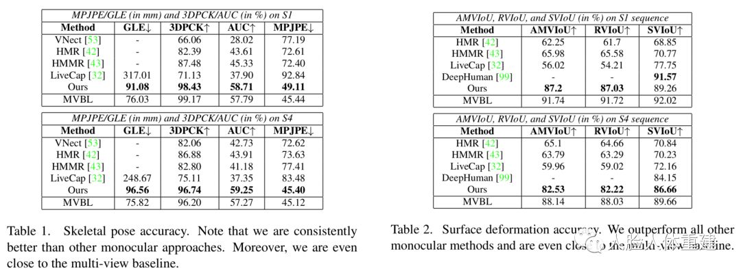 下面的两个表格展示了文章方法在骨架姿态准确性和重建网格准确性方面与其他方法的比较,文章方法都取得了更好地结果。