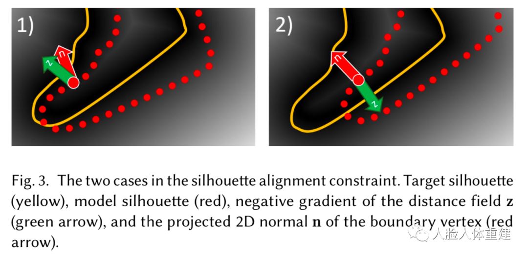 这里 是变形后的3D网格投影到相机 下的距离变换图 后的边界顶点集合, 是与 LiveCap[2] 中类似的方向权重,指导边界顶点沿着 的梯度方向运动。轮廓损失确保投影的网格边界处于距离变换图的零等值面,也就是与人体前景轮廓对齐。