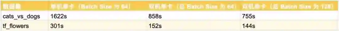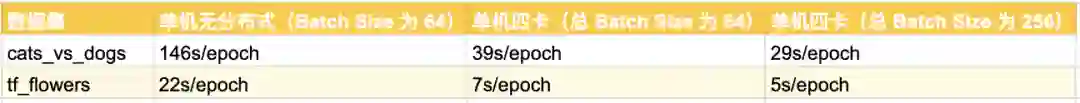 可见,使用 MirroredStrategy 后,模型训练的速度有了大幅度的提高。在所有显卡性能接近的情况下,训练时长与显卡的数目接近于反比关系。
