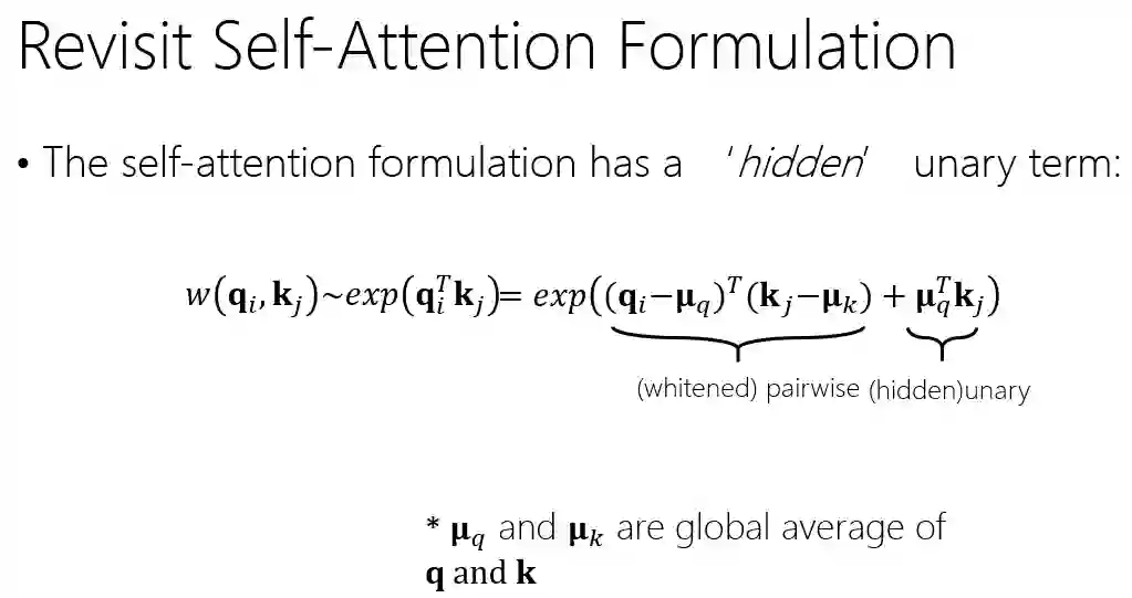 我们发现其实这样一种表达式可以分解成两项,一项是白化的 pairwise 项,还有一项是隐藏的 unary 项,注意这里白化的 pairwise 意思就是说,和之前的 Query、Key 不太一样,我们形成白化。就是先减均值,减完均值之后再做内积。这样数学形式是更纯粹的一个 pairwise 项。而第二项则是只与 Key 相关,而与 Query 无关,所以我们称为一阶项。