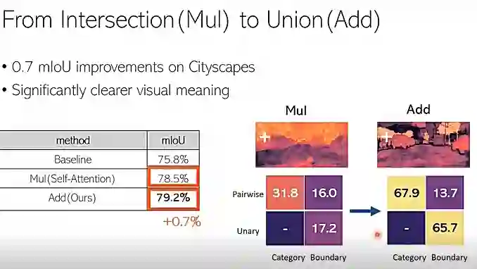 我们在语义分割的一个比较常用的标准平台评测集 Cityscapes 上面做了实验,当我们将乘法替换成加法的时候,看到了0.7个点的提升。同时,可以看到它学到的注意力图也会更有意义,就是非常清晰。这些相关系数,同时也增加了很多。从31.8提升到了67.9,从17.2提升到了65.7,很显著的提升。