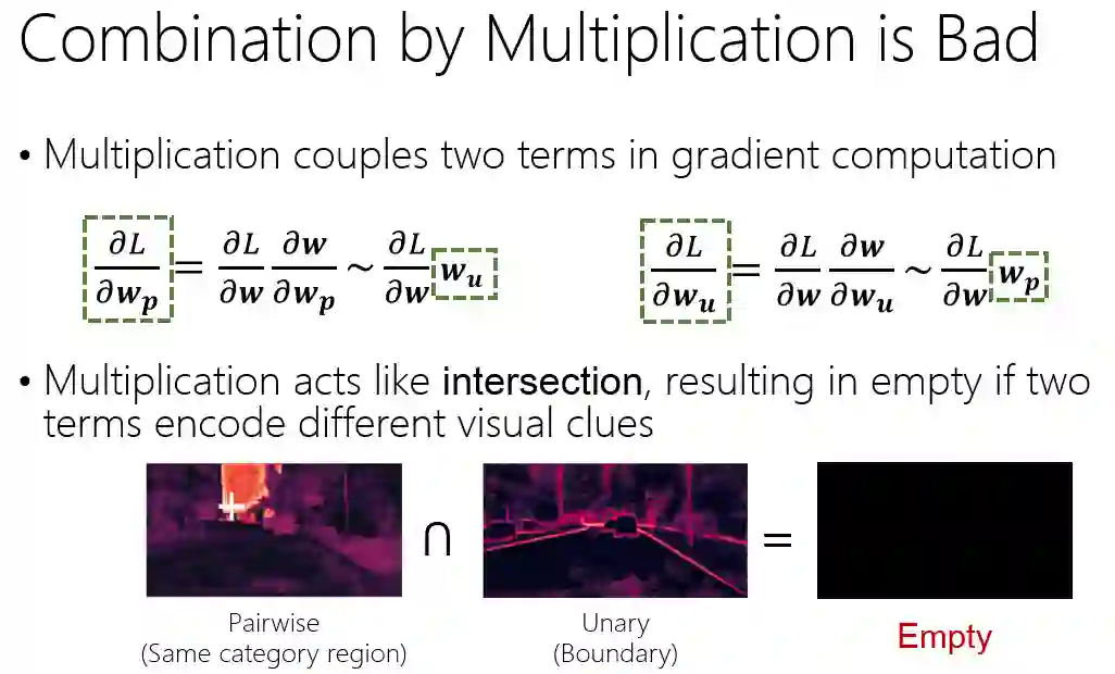 我们认为,乘项的联合不是一个太好的选择,主要有两个原因。第一个原因是乘项的联合会将两者的梯度耦合在一起。我们可以看图18中两项梯度反向传播的公式,左边是针对 pairwise 项的梯度,右边是针对 unary 项的梯度。可以看到 pairwise 项的梯度,它会和 unary 项的值呈正相关,unary 项的梯度会和 pairwise 项的值呈正相关。