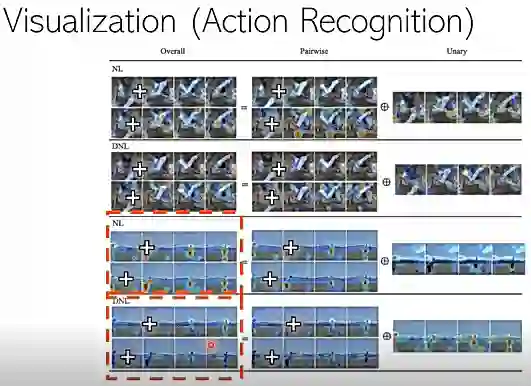 在动作识别里面,也能观察到同样的现象。图27中,我们每个视频都取了四帧放在一行,然后每一行代表不同的 Query 点。图中上部分是标准的模型,下半部分是解耦的模型。看位于图片下两行的例子,会发现不同的 Query 点对应的 attention map 长得很像,而在解耦模型里面,则会有一些跟 Query 有关的 attention map 出来,它会收到跟 Query 有关的一些性质。