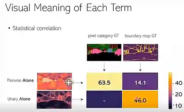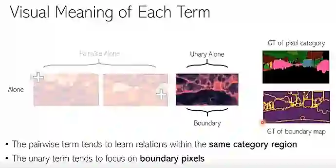 我们发现,pairwise 项会学到同一个类别内部像素之间的关系。先看左边一幅图,图里的 Query 像素,位于图片天空的区域,可以看到,所有天空区域都有一个很高的响应。再看右边这个图,图里的 Query 像素位于汽车上面,所有汽车的像素都会有一个很高的响应。