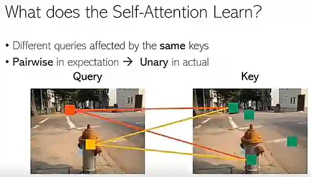但是实际上,我们会发现,结果和预期其实很不一样(如图9)。对于左边的这2个 Query 像素来说,通常会被同一组 Key 像素所影响,例如这里的2个像素(红色的线所连接的两个像素),那这也就意味着,自注意模型从一个 Query 有关的模型退化到了一个 Query 无关的模型。那起作用的很有可能是一个一阶的、全局的 unary 模型,而不是我们所想要的二阶的 pairwise 模型。