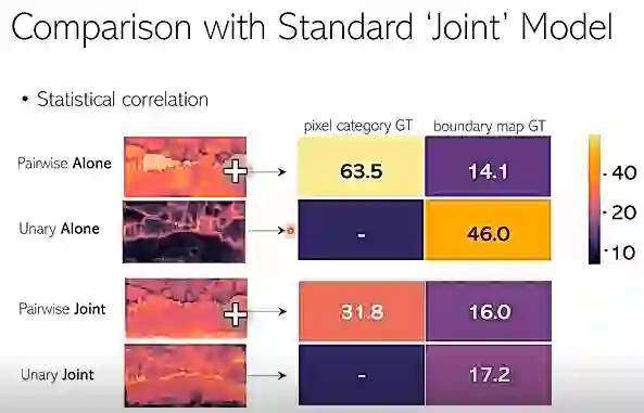 我们统计了学到的注意力图和 GT 的每个像素类别的 region,以及边缘图的相关系数。图15为结果,其中63.5指的是 pairwise 项和像素区域图的一个相关系数,46.0表示 unary 项和边缘图的相关系数。它们都还比较高,所以可以看出它们其实有一个很强的相关性。