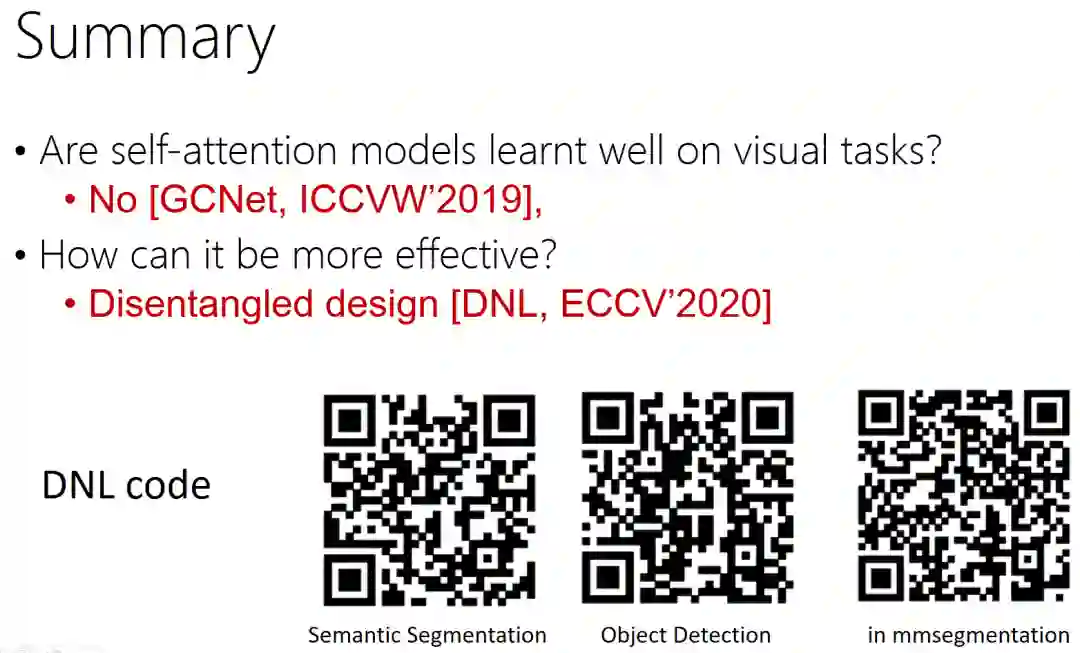 最后做一个简单的小结。在这次分享中,我们尝试着回答了2个问题。第一个是,在视觉任务里面,自注意模型有没有被学好?那我们的回答是,大部分其实没有学好。如果大家感兴趣可以去看我们去年的 GCNet 工作。第2个问题是,怎么样才能够有效地建模自注意模型?我们提出了一个解耦的设计,它可以更有效地学到建模这个制度与机制。