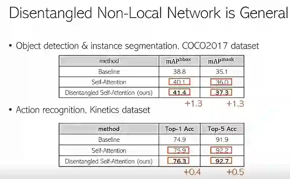 同时这些模型也很通用,也能够去改进物体检测。图25中的第一个表格是把它应用到 COCO 物体检测里的一个例子,bbox 和这个 mask 都有1.3个点的提升。同时,把它应用在 Action recognition,基于 Kinetics 来做评测,它 Top-1 和 Top-5 都有0.4和0.5个提升。考虑到标准的 attention model,针对 baseline 提升相对很显著,几乎是100%。