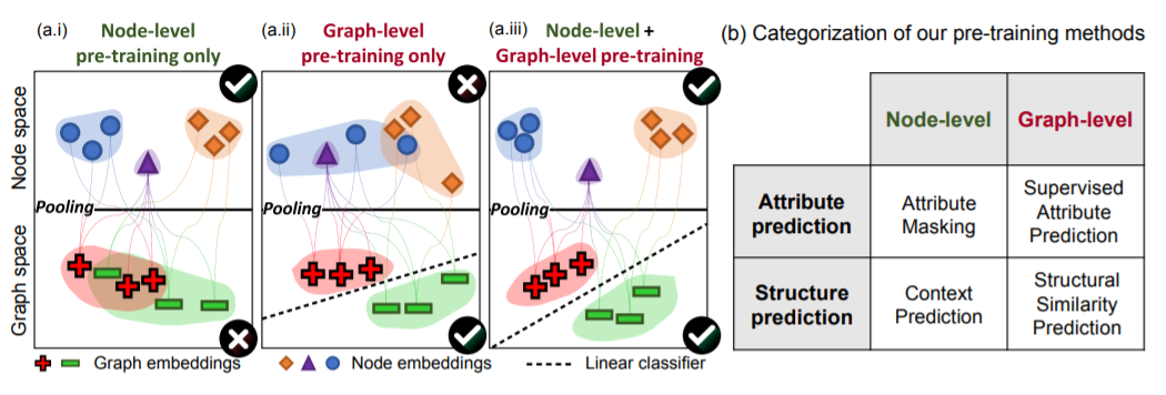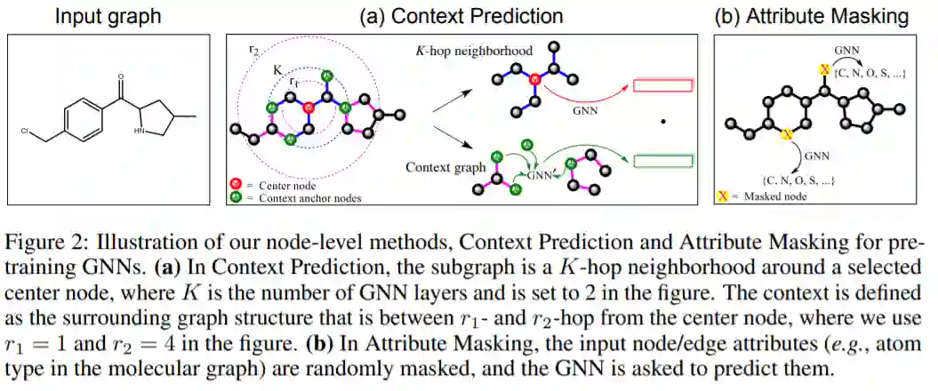 对于GNN的节点级预训练,我们的方法是使用易于访问的未标记数据来捕获图中的特定领域的知识/规律。 在这里,我们提出了两种自我监督的方法,上下文预测和属性屏蔽。