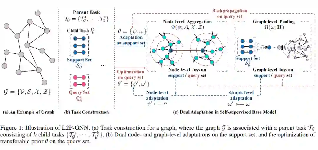 为了减少这个偏差,论文中提出了L2P-GNN,一个自监督的预训练策略。L2P-GNN的中心思想是,在预训练的过程中进行微调,使得模型可以快速适应新任务。这样学习到的初始化不仅对节点之间的局部连通性进行了编码和调整,还能泛化到图的不同子结构。