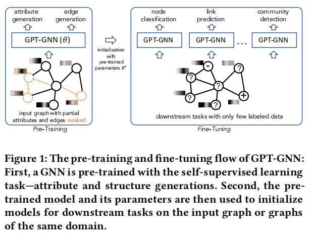 图2展示了GPT-GNN的预训练和微调流。首先,GNN可以通过自监督学习任务进行预训练,生成属性和边。然后,预训练的模型和他的参数可以被用来初始化模型。