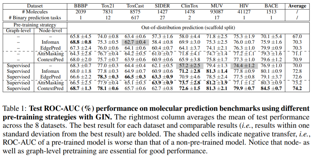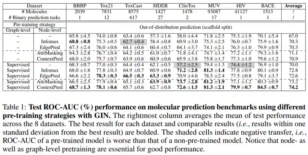 经过在多个图分类数据集上的研究,我们发现,传统的策略(要么在整个图上,要么在单个节点上预训练GNN)的性能提升是受限的,甚至可能会在下流任务上造成相反的迁移。而我们的策略避免了相反的迁移,并且在下流任务上提升了泛化能力。相较于SOTA模型能够得到高达9.4%的ROC-AUC提升。