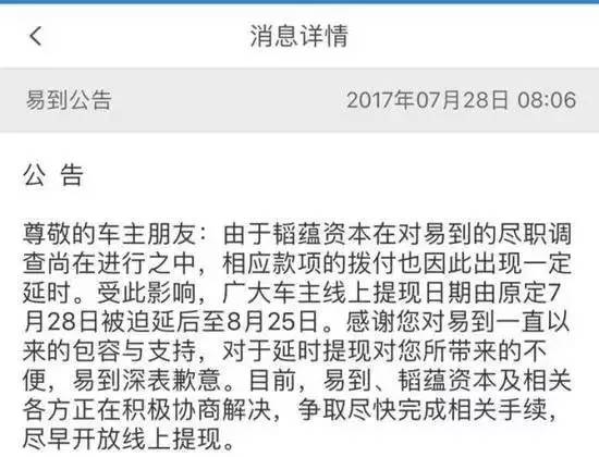 7月28日上午,易到给司机发公告称,司机线上提现日期由原定7月28日被迫延后至8月25日。该公告称,司机提现延期的原因,是韬蕴资本在对易到的尽职调查尚在进行之中,相应款项的拨付也因此出现一定延时。 不过,有知情人士透露,本次易到司机提现资金“断流”,是因为乐视要把此前以易到名义抵押借款的14亿元债务转给韬蕴,但此举遭到韬蕴资本CEO温晓东的反对,因此中断了给易到的司机提现资金。
