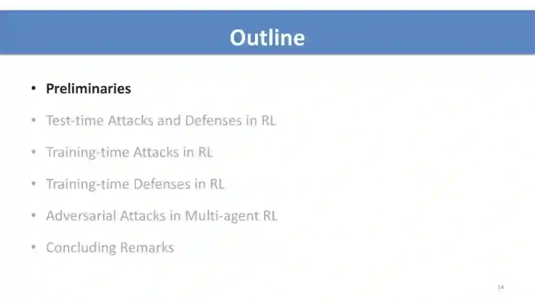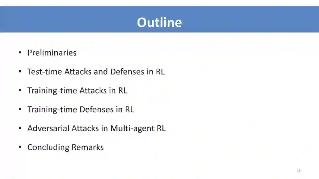本教程将概述在序列决策设置中的对抗性学习的最新研究。特别地,本教程将侧重于基于多臂赌博机、强化学习和多智能体交互的对抗性攻击和防御机制。本教程将暂时涵盖以下列出的内容。