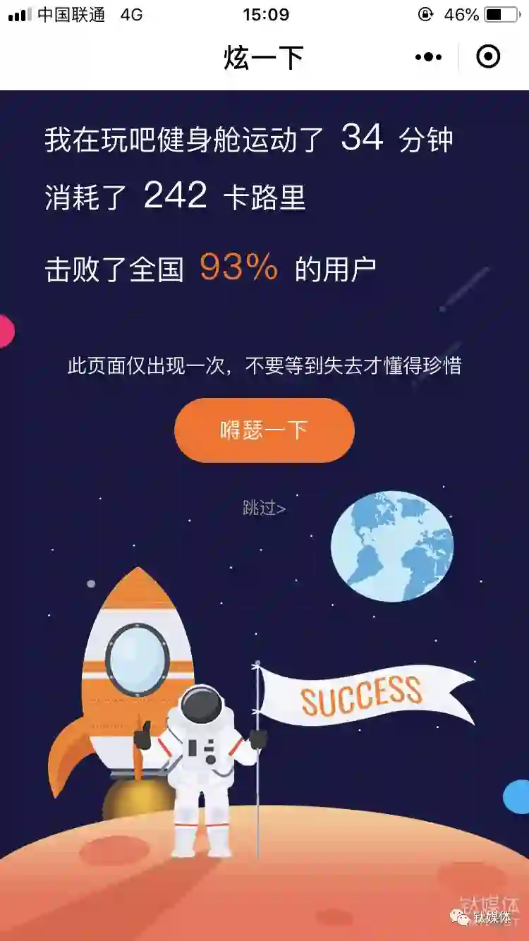 在里面嗨了半个小时只要6块钱,现在哪还有这么便宜的健(K)身(T)舱(V)呢?支付结束后,小程序会显示出一张海报,上面会记录着你此次的健身数据。