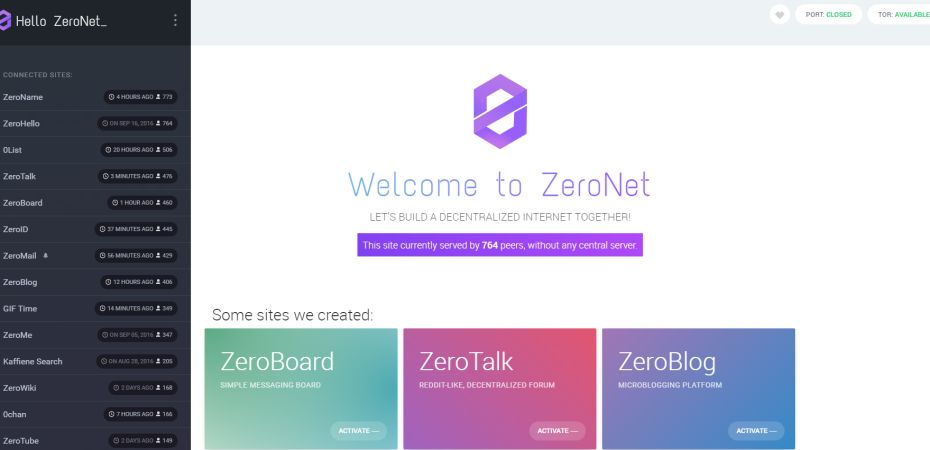 在没有使用任何中心服务器的情况下,ZeroNet 有去中心的微博、去中心的微信、去中心的在线视频网站、去中心的音乐网站等等,基本上你在普通互联网上每天要做的事情,在 ZeroNet里都可以实现。