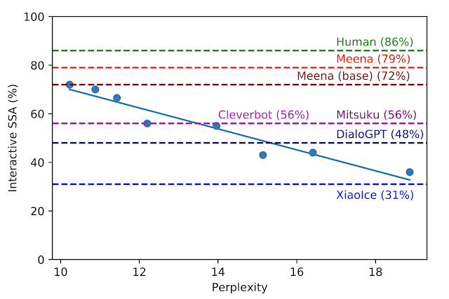每个蓝点都是都是 Meena 模型的不同版本。这里绘制出了回归曲线,表明 SSA 与困惑度之间存在很强的相关性。虚线则表示了人,其他机器人,Meena(base),端到端的训练模型以及具有过滤机制和调整解码的 Meena。
