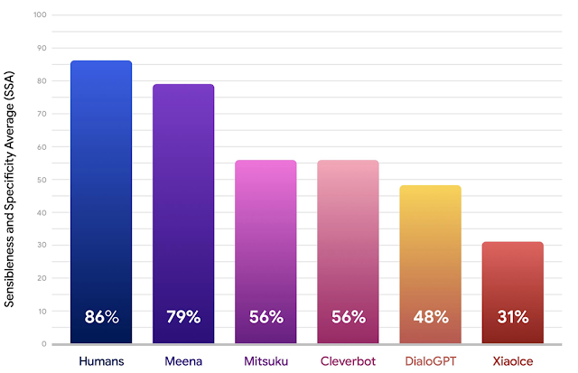 最好的端到端 Meena 训练模型,被称之为 Meena(base),实现了 10.2 的困惑度(越小越好)转化为 72% 的 SSA 得分。与其他获得 SSA 分数相比,72% 的 SSA 分数与普通人获得的 86% 的 SSA 分数相差不远。Meena 的完整版具有过滤机制和调整解码,会进一步将 SSA 分数提高到 79%。