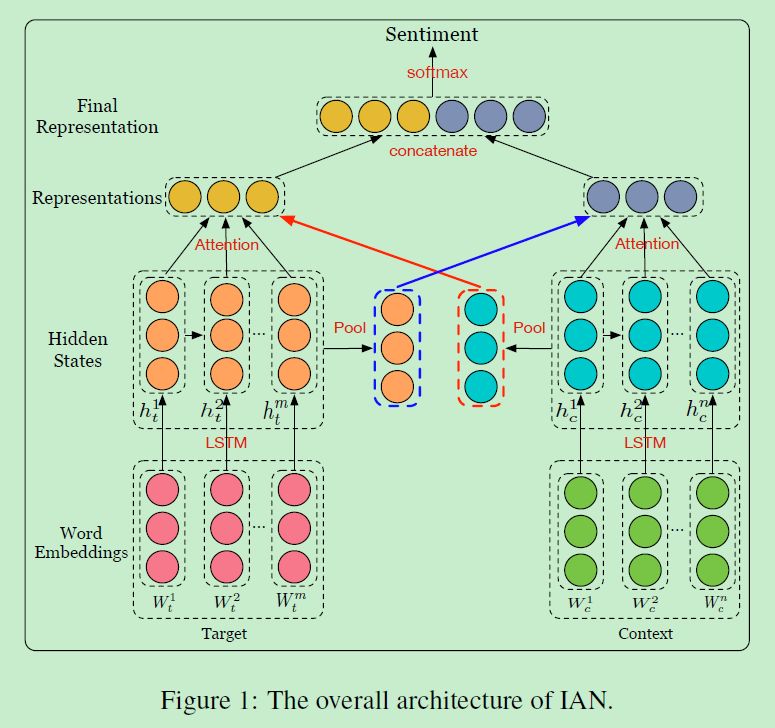 这篇文章作者的思路也是将target和context进行交互获取句子的准确表达,利用的模型是attention。与上面几个模型不同的在于,这里考虑了target可能存在好几个word组成的短语,另外添加了一层对于target的attention操作用于计算权重。提出了Interactive Attention Networks(IAN), 整体模型框架如下: