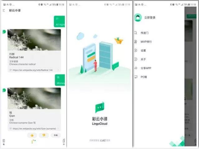 据介绍,彩云小译采用人工智能“神经网络”翻译,又以译言网等高质量翻译数据作为训练资料,并可以自动识别普通话、英语等语种,无需按键即可实时录音并翻译,其“普通话-英语”的翻译准确度已经达80%。