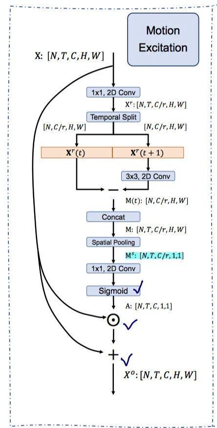 相比于 SENet 增加一个residual connection 增强 motion information 同时保持 scene information(背景信息)不丢失,表示 channel-wise multiplication.