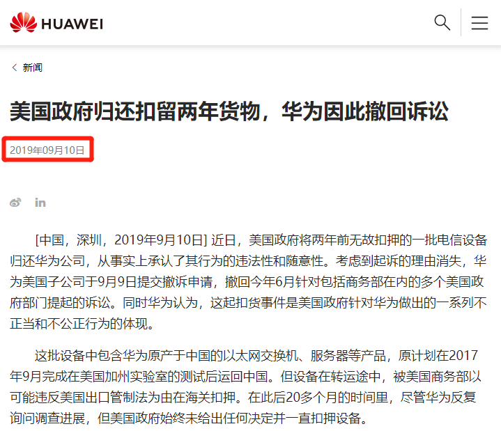 此外,值得注意的是,据华为官网9月10日公告,近日,美国政府将两年前无故扣押的一批电信设备归还华为公司,从事实上承认了其行为的违法性和随意性。考虑到起诉的理由消失,华为美国子公司于9月9日提交撤诉申请,撤回今年6月针对包括商务部在内的多个美国政府部门提起的诉讼。同时华为认为,这起扣货事件是美国政府针对华为做出的一系列不正当和不公正行为的体现。