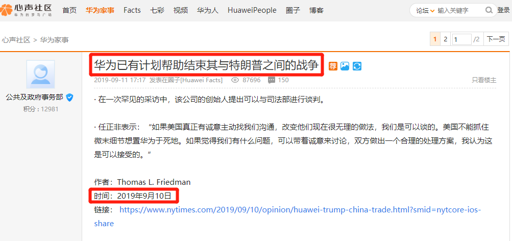 9月11日,华为的心声社区披露, 在一次罕见的采访中,任正非首次提出与美司法部谈判:计划帮助结束与特朗普的战争。