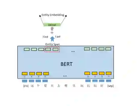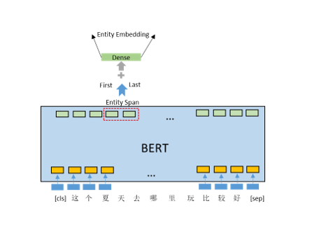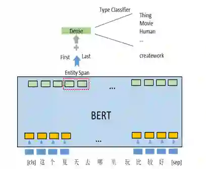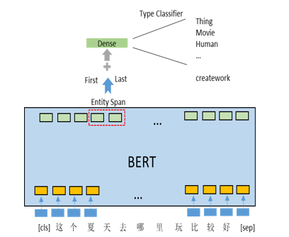DeepType模型的设计思路见图4。输入语句经过Bert获取到上下文相关字向量后,提取出实体区域(Entity Span)中第一个字和最后一个字的向量连接在一起,最后进行全连接(Dense)输出到各个候选类型进行多分类。分类层最后经过softmax归一化后取交叉熵作为损失函数。