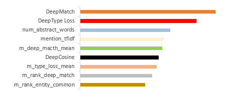 本文从三个不同方面刻画了实体和候选实体的相关性。因此最后需要通过模型融合(stacking)的方式来结合这三种特征以及其他一些数值特征来帮助模型进行消歧。最后二分类预测模型采用是lightgbm[14]这种梯度提升树。DeepType模型预测自身形成的特征是实体类型和候选实体类型的交叉熵损失函数(Type loss)。DeepMatch预测自身生成的特征是实体和候选实体的匹配程度(0-1)。DeepCosine预测自身生成的特征则是实体和候选实体的向量的余弦距离。结合这三个特征和其他数值特征比如历史点击率,摘要的长度等,同时对这些特征相对于实体进行排序,得到他们的排序特征。这些特征工程完成后由lightgbm树模型输出他们的二分类预测结果。