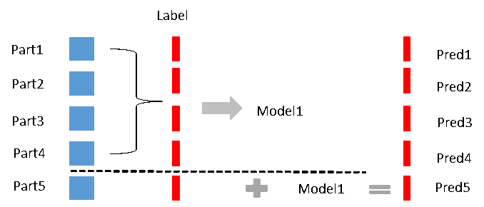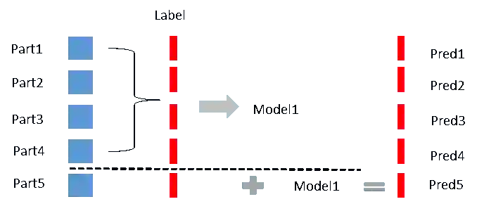 在实体链指消歧任务中,本文令每个候选实体和输入语句中的实体一一配对,形成一个二分类问题。将9万训练集一一配对后得到的总的二分类任务数据条目是150万以上。这么大数据量的分类任务采用lightgbm这种高效的梯度提升树来建模是非常有效的。对于这些分类任务中的特征,主要采用了DeepMatch、DeepCosine、DeepType三种模型做预测自身而生成。如图7所示,先把数据分成5份。取其中四份数据和对应的label训练一个模型model1。该模型对part5进行预测,得到自身的预测部分pred5。同理,循环这个过程,分别得到5个模型对Part1-5进行预测生成Pred1-5。这些预测结果连接在一起就可以构成该模型形成的一个特征。同时用这五个模型对测试集进行预测求平均,则得到测试集的特征。