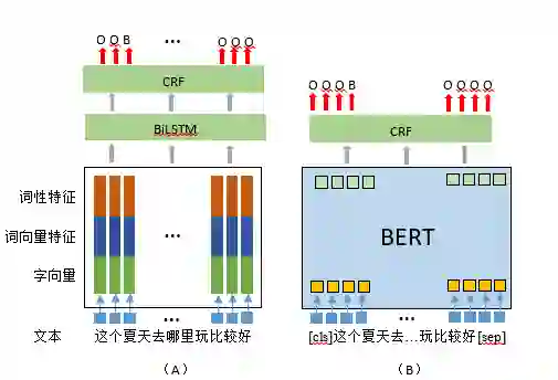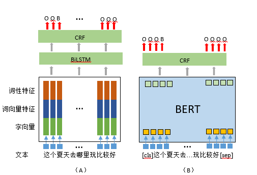 图1. 命名实体识别模型的设计。(A) 基于经典方法设计的实体识别模型,字、词向量采用了基于百度百科的300维词向量1。词向量特征为该字对应的分词结果中的词向量,同理词性特征为随机生成的100维向量;(B) 基于BERT Finetune[5]的识别实体模型。在原来BERT的基础上,增加了一层CRF层来实现更好的标注学习。