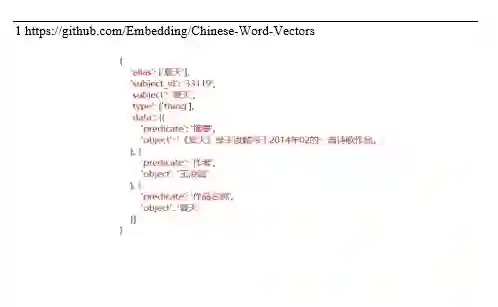 知识库实体向量的表征对知识库中实体的识别至关重要。类似OpenKE[13]的工具对于帮助生成实体向量很有帮助。本文所使用的文本虽然具备一定的三元组结构,但是该三元组的末段即宾语结构部分并不常常是一个实体,而是一段描述文本。因此为了获得每个知识库中的实体表征,本文采用gensim中的word2vector方式,将知识库中的每个三元组,即(subject,predicate,object)都当成单独的一句话。Subject部分则用‘subject_id’代替形成一个完整的token。如下图5所示。最后生成的’33119’对应的词向量即被认为是该实体的实体向量。
