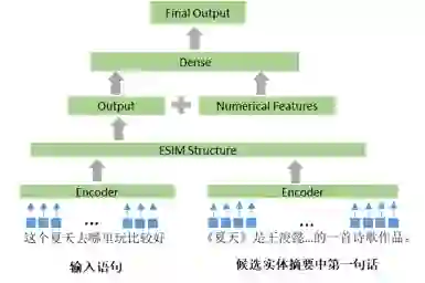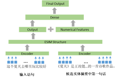 对于输入的文本“这个夏天去哪里玩比较好”,我们将此文本和所有候选实体一一配对。从中找出正确的配对的过程是一个二分类问题。因为输入语句上下文对实体消歧有很大的帮助[8],因此本文构建了一个DeepMatch模型来匹配输入语句的上下文和候选实体的说明语句。候选实体的说明语句采用了摘要中的第一句话作为该候选实体的说明。采用的模型设计结构则是参考经典的ESIM[12]架构进行改进。如图3。其中输入语句和摘要文本中第一句话的encoder是基于百度百科的字向量。