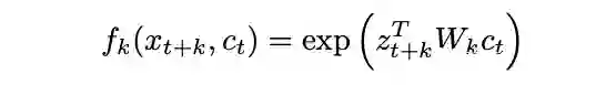 由于没有办法获得到 的联合概率,因此文章通过建模两种样本的密度比的方式来绕过联合概率(两种样本:真实样本和采样出来的负样本),其中 表示 的预测和未来 的相似程度, 是将 转换到 空间,然后用内积来表示相似程度,文章也证明了 。