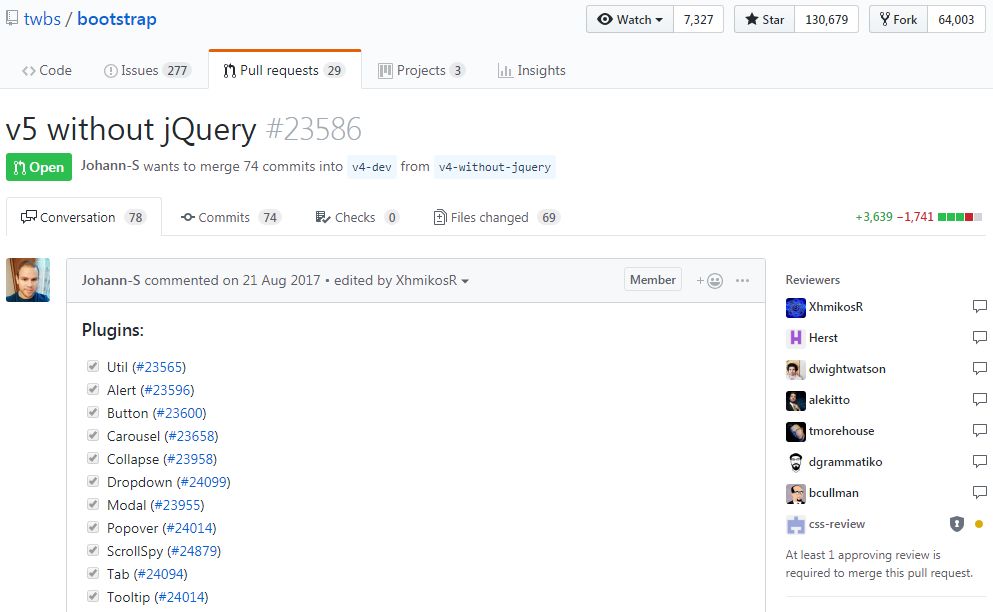 可以看到,在 Bootstrap 5 中移除 jQuery 这个 PR 从提出到今天已经经历了一年半的时间,目前包含了 74 个 commits,正处于 Open 的状态,还有待解决的冲突。