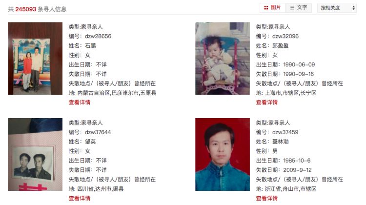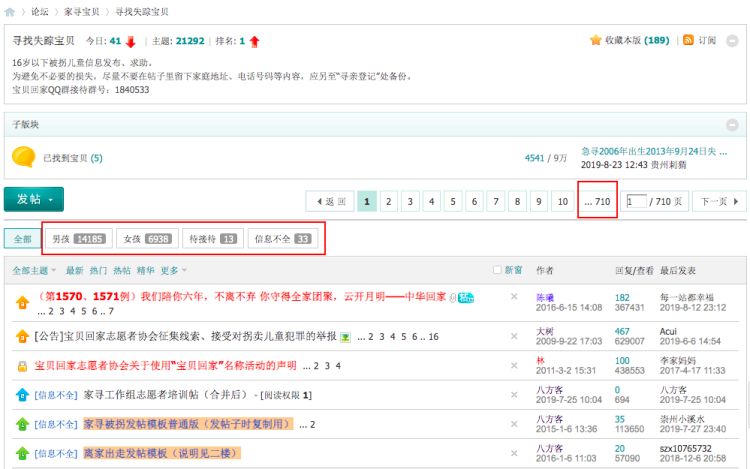PingWest品玩通过浏览国内最大的非官方寻子网站“宝贝回家”,其论坛上的“寻子帖”足有710页,有标记的帖子中显示14185名男孩和6938女孩仍无下落。