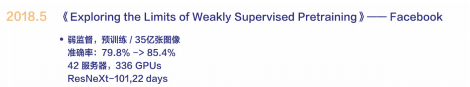 今年上半年 Facebook 发布了一个研究结果,收集 35 亿张弱标注图片,使用几百块 GPU,经过接近一个月的时间,训练了一个用于图片分类的卷积神经网络模型,它能做到什么效果呢?能提高 6 个百分点的准确率。这是非常了不得的成绩,算法基本上没什么变化,仅仅是通过采用更多的数据和计算就能把 top-1 的准确率提高了这么多。要知道,对于一个商业价值很高的场景,提高 0.5 个百分点可能是一个团队一年的 KPI。