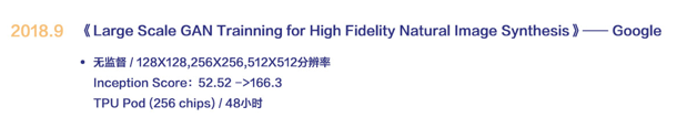 九月份 Google 发表了 BigGAN 模型,研究人员通过提高图片的分辨率来训练更大的 GAN 模型,CNN 中间的 activation 和反向 gradient 会非常多,当然计算量也会大的非常多,基于 TPU 集群来完成训练。这个手段同样获得了比以前的 GAN 模型好的多的效果。