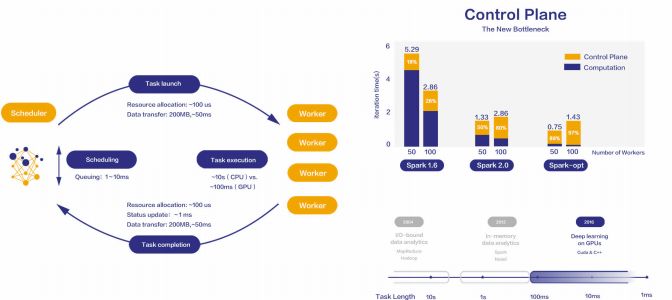左图展示了一个常见的大数据处理引擎的架构,集群中的计算资源一般分成用于中心调度的 Master 节点和用于处理数据的 Worker 节点。Master 节点以有向无环图(DAG)的方式管理整个作业的进度,同时监控所有 Worker 的资源使用状况,在合适的时机把一个子任务(Task)分配给某个 Worker 去做,某个 Worker 在完成一个子任务之后,会向 Master 节点汇报,等待 Master 分配新的任务。在传统大数据处理中,Worker 执行一个子任务的时间量级一般在几十秒钟或数分钟。其它开销,诸如发生在 Master 节点那里的排队开销,Master 和 Worker 之间对话的时间开销,以及数据传输开销都是数十毫秒,相对于 Worker 的工作时间可以被忽略。但是深度学习训练的负载与此不同,深度学习训练更接近流式计算,一方面是因为随机梯度下降算法采用的小批次训练,计算粒度小,另一方面是因为底层硬件吞吐率可能是 CPU 的数十倍,计算太快。直接后果就是,数据处理时间越来越短,每个子任务可能几百毫秒就完成了,在这种情况下,之前可忽略的那种几十乃至几百毫秒的开销就非常显著了,如果不能通过技术手段把这些开销消除或掩盖掉,整个系统的性能就非常低。