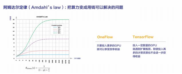 上面的评测结果中,在 32 卡时,OneFlow 仍是线性加速,当卡数增加到一定程度,譬如几百或者是上千时迟早会遇到天花板。并行效率不同的系统,只是遇到天花板时间早晚的问题,这是阿姆达尔定律所揭示的规律。比如说上图绿色曲线表示一个并行度(parallel portion)为 95% 的任务,什么时候遇到天花板呢?可以计算出来,加速到 20 倍的时候就到了天花板了,后面投入再多的资源进去它也不可能再加速了。假设系统的并行度不随卡数变化,在卡数少时,大部分系统还是比较接近线性的,各个系统之间差别很小,但当卡数增多时,系统迟早会遇到天花板,即使增加再多的 GPU 也不会进一步提升吞吐率。这表明,在卡数比较少时实现线性加速比不一定能在卡很多时还能实现线性加速,但在卡数较少时就实现不了线性加速,在卡数更多时肯定距离线性加速更远。由此可见,把系统的运行时开销优化到极致,对于大规模集群训练效率是至关重要的。